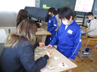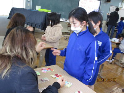 3年生の英語の時間です。英語でカードを作って先生にプレゼントします。ALTは折り紙屋さん。カードを飾る折り紙の、形と色と何枚欲しいか、ALTに英語で話してもらいます。アルファベットを書いて、素敵なカードを作ろうと一生懸命な子供たちです。渡す時も楽しみですね。