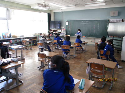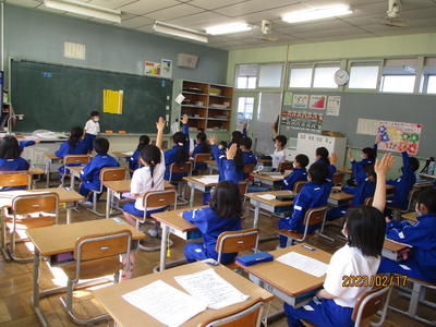 2年生が1組2組合同で道徳をしました。「きれいになった図工室」のお話を資料に、自分がしたことでみんなが気持ち良く生活できることや、みんなの役に立つことはうれしいことなんだと気付きました。3年生からは1クラスになる子供たち、みんなで勉強すると楽しいと話していました。いつもと違うことにも気付きました。