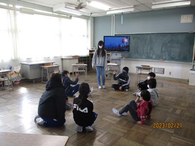 虹の会による高学年への読み聞かせがありました。子供たちはじっと聞き入っていました。4年生は読み聞かせをしていただいた手作り大型紙芝居を見せていただきました。新聞紙や色紙を使った手作り紙芝居に子供たちは感動していました。