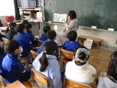 虹の会の皆さんによる読み聞かせがありました。今日から2月、もうすぐ春です。季節や今の子供たちに合わせて本を選んでいただいています。今日は高学年の読み聞かせです。