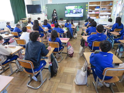 音楽集会をオンラインで行いました。今日は1年生、2年生、3年生の音楽発表です。1年生は「はる なつ あき ふゆ」を動きを付けて歌い、「きらきら星」の合奏をしました。2年生は1組、2組とも「こぎつね」を歌い、鍵盤ハーモニカで演奏しました。3年生は「ふじ山」を歌いました。そして、「新時代」に合わせてボディーパーカッションをしました。1・2・3年生の発表は元気で楽しい発表でした。