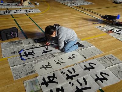 1月10日(水) 3校時 4校時 4年生は「書き初め大会」を行いました。静寂に包まれる体育館で「一筆入魂」で「美しい空」を書き上げました。体育館に「美しい空」が広がりました。