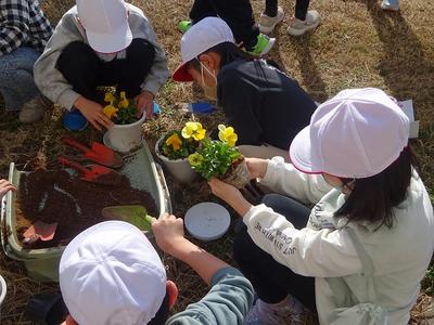 今日は、1年生と2年生がパンジー植えに挑戦しました。
