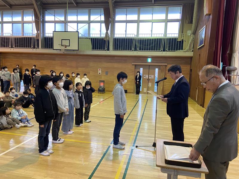 1年生から5年生までの代表者が修了書証を堂々と受け取りました。