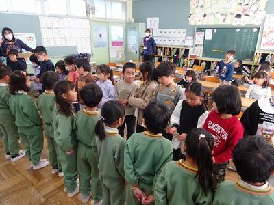 今日は、1年生と七日市こども園の年長さんとの交流会がありました。