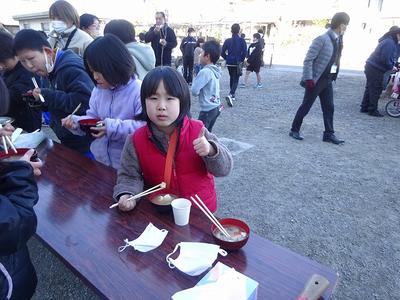 富岡小学校PTAによる、どんど焼き、繭玉焼き、マッシュルーム焼きの他、けんちん汁をいただき楽しい時間を過ごすことができました。
