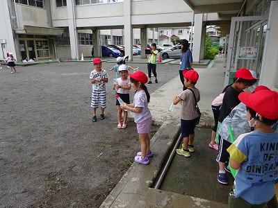 1年生は、校庭で水遊びをしました。様々な入れ物を用意して、友だちと元気よく遊んでいました。
