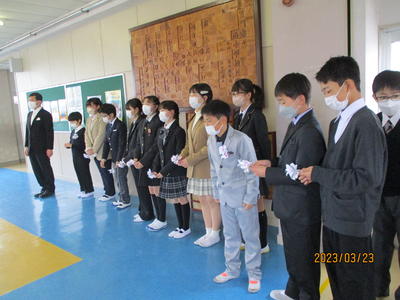 6年生の班長・副班長から、4月からの班長・副班長へリボンの引き継ぎが行われました。6年生の皆さんこれまで登校班でみんなの安全を守ってくれて、ありがとうございました。これから卒業まで、班長として気を付けてきたこと、危険な箇所を後輩に伝えて欲しいと思います。そして、新しく班長・副班長になるみなさんが中心となって、安全な登下校で交通事故ゼロを続けましょう。