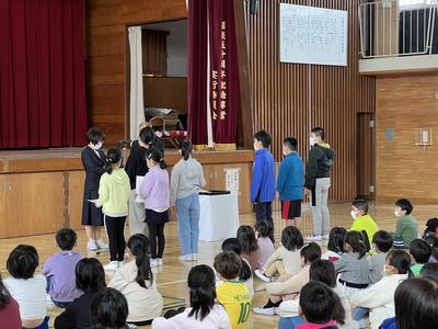 6年生の班長・副班長から、4月からの班長・副班長へリボンの引き継ぎが行われました。6年生の皆さんこれまで登校班でみんなの安全を守ってくれて、ありがとうございました。これから卒業まで、班長として気を付けてきたこと、危険な箇所を後輩に伝えて欲しいと思います。そして、新しく班長・副班長になるみなさんが中心となって、安全な登下校で交通事故ゼロを続けましょう。