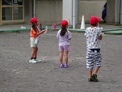 1年生は、校庭で水遊びをしました。様々な入れ物を用意して、友だちと元気よく遊んでいました。