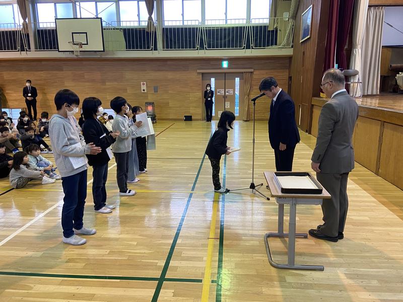 1年生から5年生までの代表者が修了書証を堂々と受け取りました。